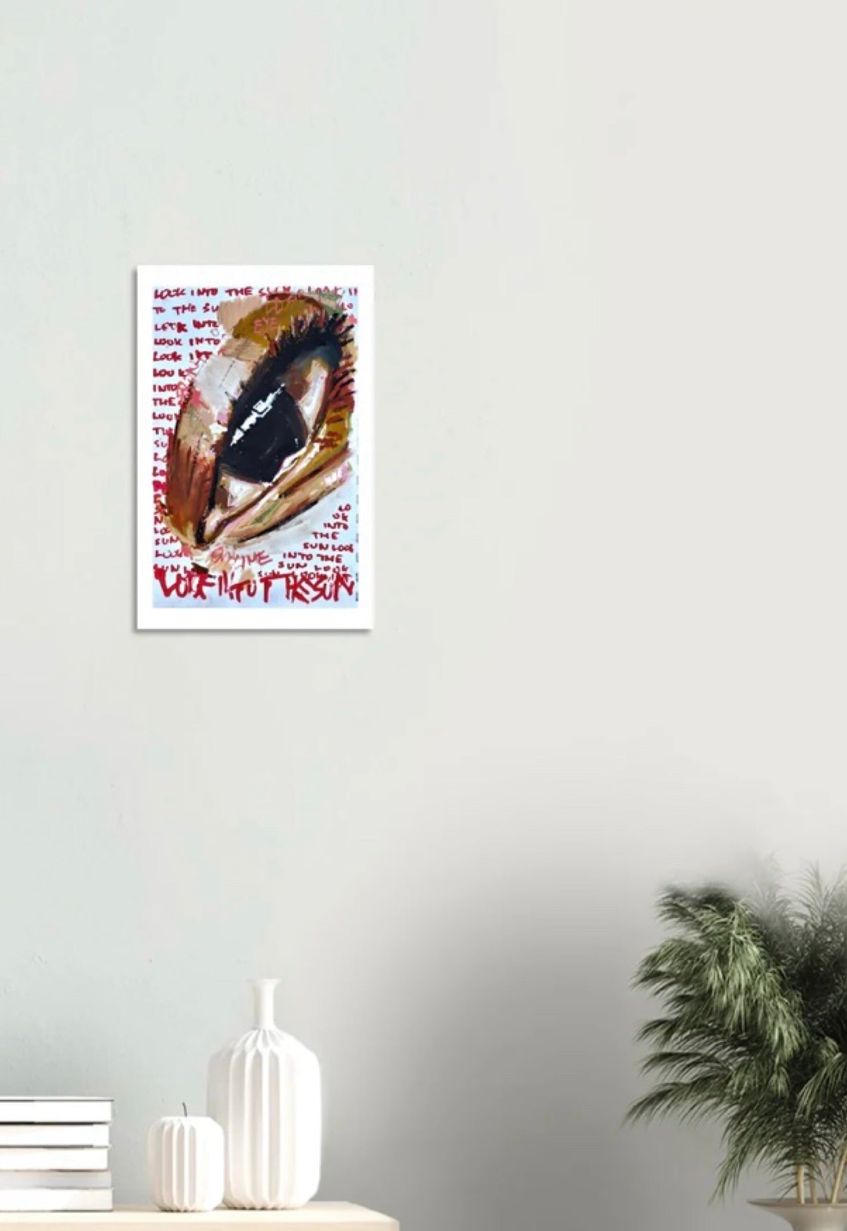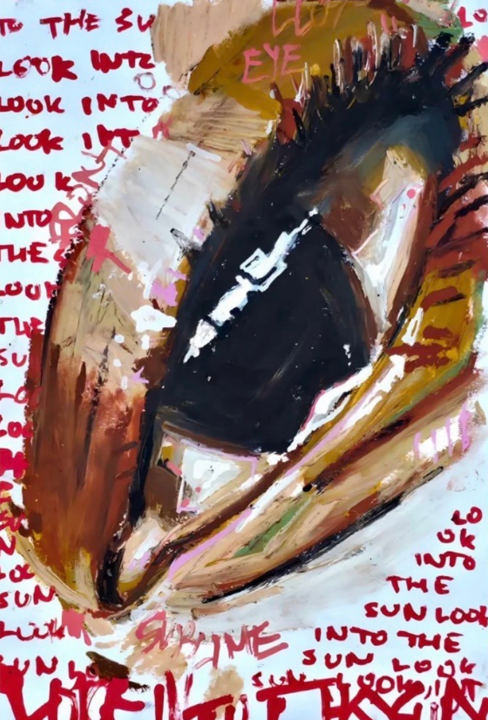 Inspired by the vibrant eye and the repeated phrase "Look into the sun." Looking beyond searching for light & confronting powerful forces.